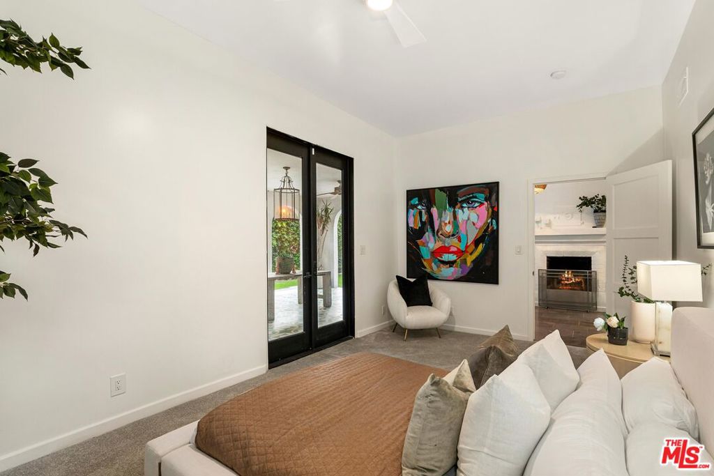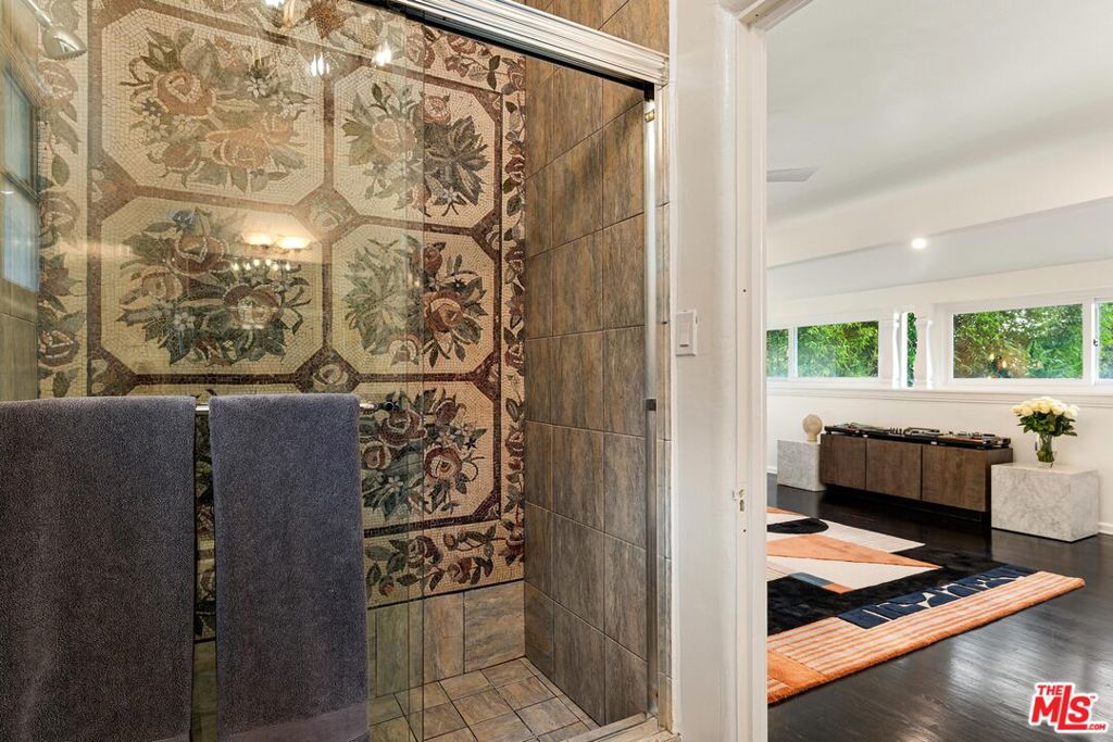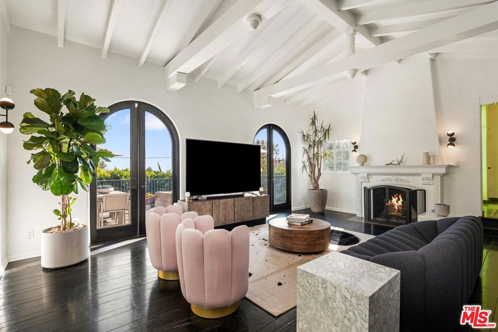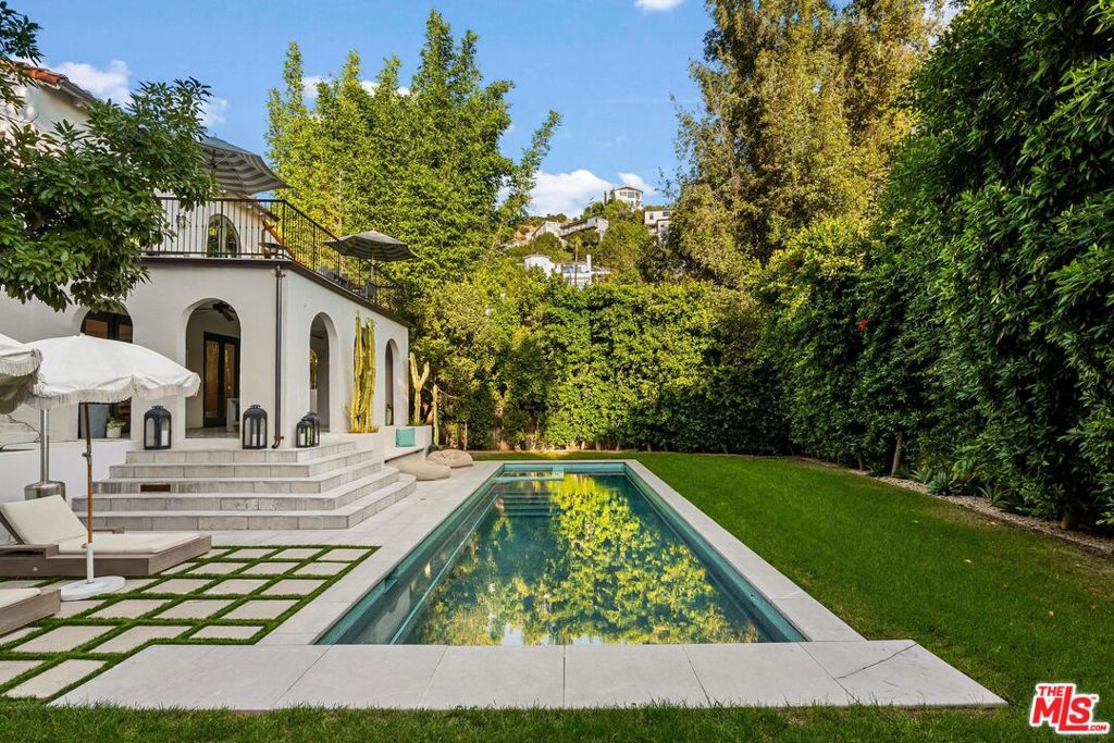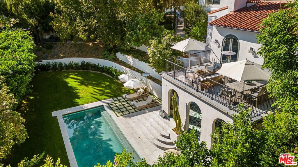 Perched in the coveted Hollywood Hills, this stunning Spanish-inspired estate masterfully blends old-world charm with modern sophistication. Tucked behind private gates and lush greenery, the home exudes character with its stained glass accents, hand-painted Spanish tiles, and intricate wrought iron details. Step inside to be greeted by a striking stained-glass window and exquisite tilework, setting a refined yet inviting tone. The main level features a grand living room with a fireplace, seamlessly extending to two patios that showcase breathtaking city views. A formal dining room and a chef's kitchen, complete with marble countertops, a spacious walk-in pantry, and a wine fridge, offer an ideal setting for hosting. Illuminated by bespoke Murano glass chandeliers and designer lighting from Soho Homes & Allied Maker, the residence radiates elegance throughout. The lower level is home to a custom screening room that opens to a charming loggia, leading directly to an outdoor sanctuary. The beautifully reimagined gardens by acclaimed designer GSSM frame a sparkling pool, spa, and manicured lawn, all enhanced with smart irrigation technology for effortless maintenance. With five bedrooms and four and a half bathrooms, this home provides a perfect balance of luxury and comfort. Behind the gated driveway, five-car parking adds convenience, including an attached two-car garageone thoughtfully converted into a state-of-the-art private gym, complete with cutting-edge equipment and an oversized LED-lit custom mirror. Positioned just moments from the Sunset Strip, this exceptional property captures the essence of Hollywood Hills living, offering a private retreat with sweeping views and a seamless indoor-outdoor flow.