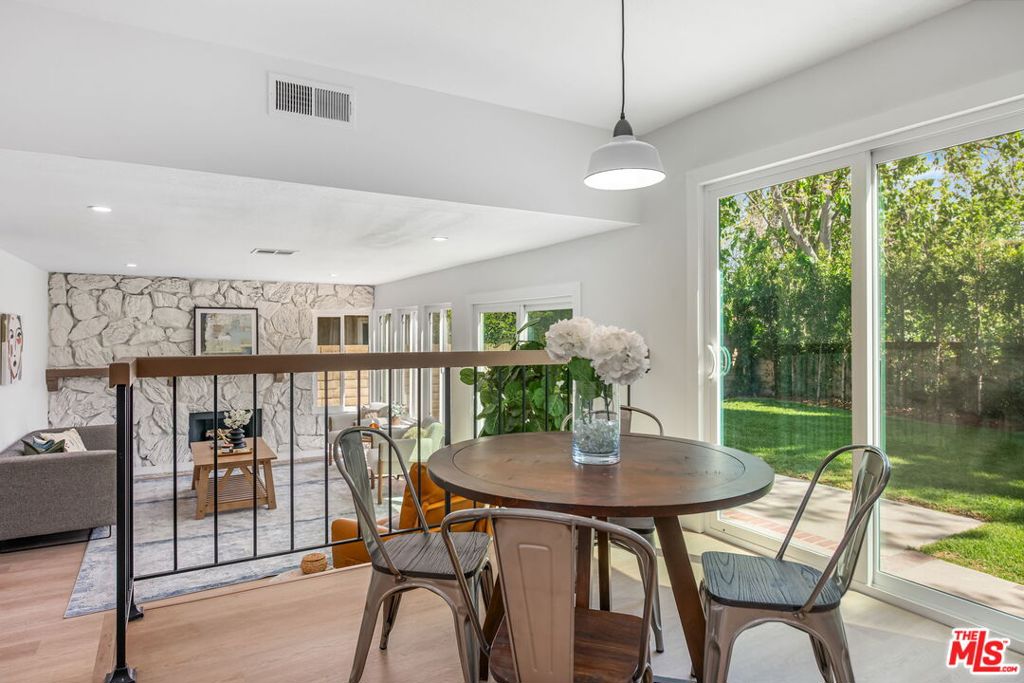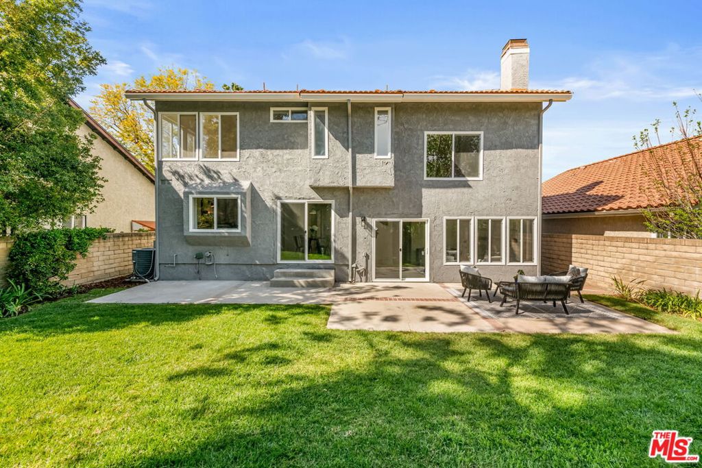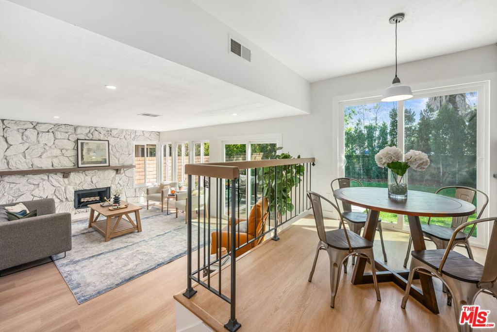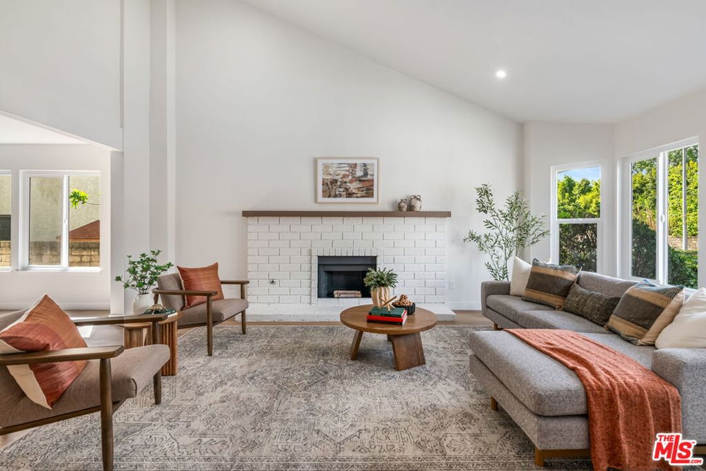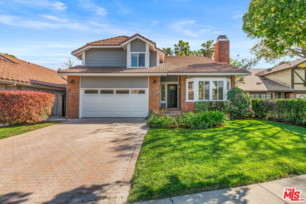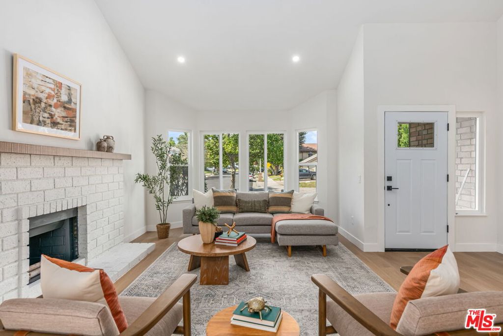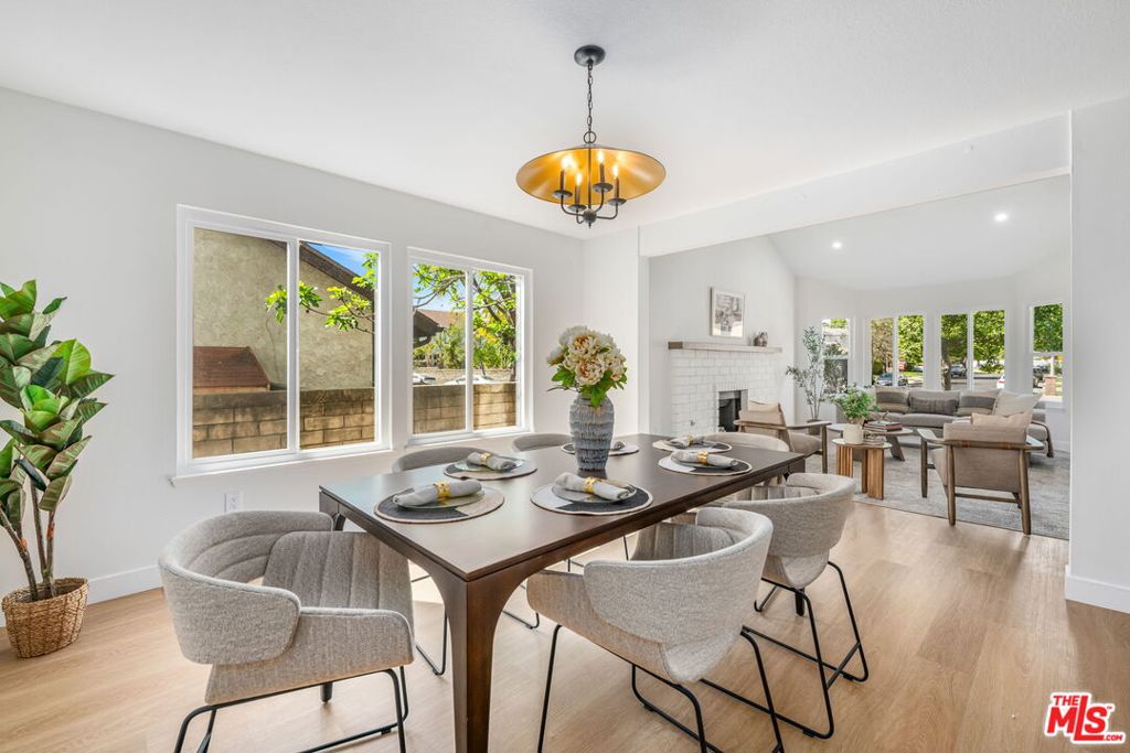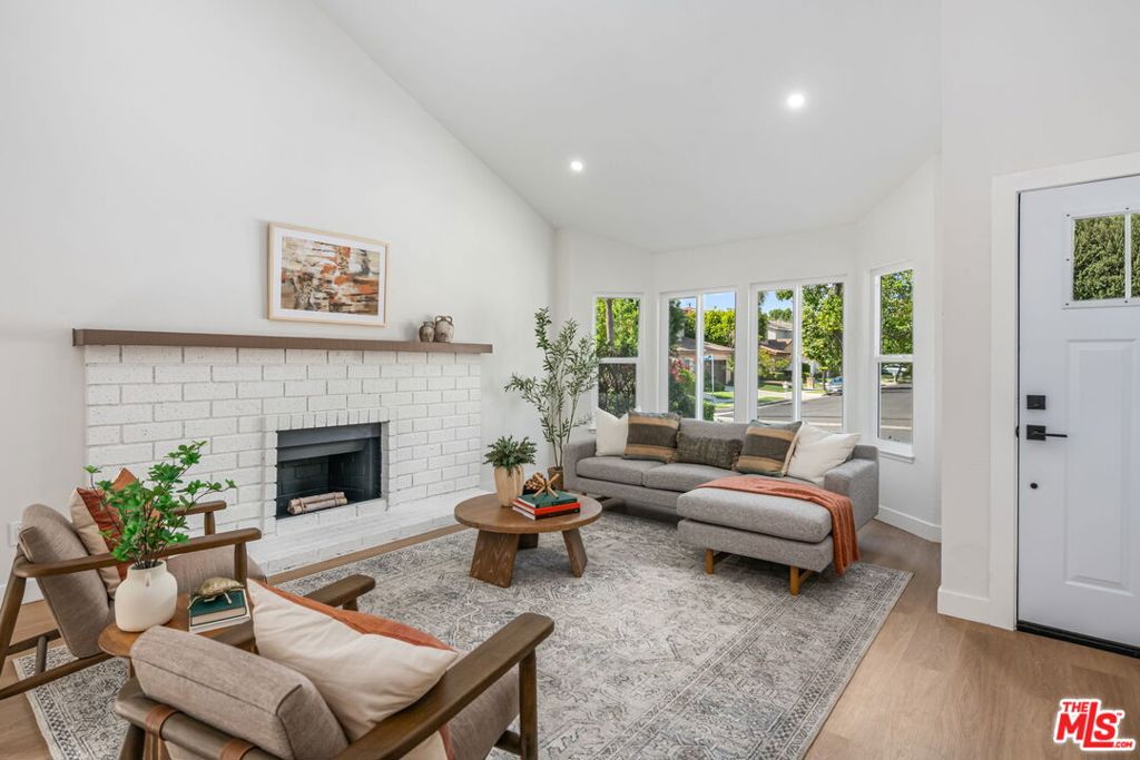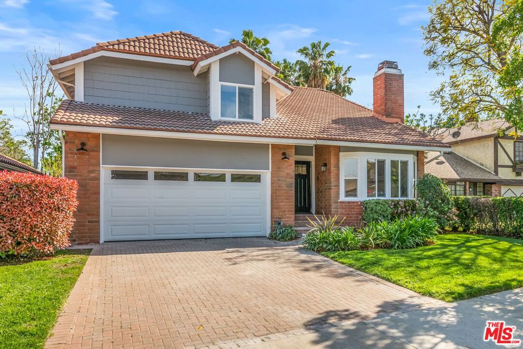 Beautifully updated two-story traditional makes a striking first impression with its timeless brick-accented facade, manicured landscaping, brick-paved driveway, and welcoming covered entry. Step inside the sun-soaked living room with soaring vaulted ceilings, wide-plank laminate wood floors, and recessed lighting. A stunning whitewashed brick fireplace anchors the space with character and charm. The open-concept layout flows naturally into a spacious dining room filled with natural light. The thoughtfully designed kitchen features soft-tone shaker cabinetry, quartz countertops, floating shelves, and stainless-steel appliances all framed by large windows and sliding glass doors that overlook the expansive backyard. A cozy breakfast nook connects to the lower-level family room, which centers around a dramatic floor-to-ceiling stone fireplace, flanked by oversized windows that bring the outdoors in. Upstairs, the generous primary suite with soaring vaulted ceilings offers a peaceful retreat, complete with a walk-in closet and a private en-suite bathroom that blends space, light, and modern style. Features include a dual-sink vanity, checkerboard tile, a walk-in shower with frameless glass, and a freestanding tub positioned beneath high windows for natural light and privacy. Three additional bedrooms upstairs each offer unique charm including a built-in window bench in one and mirrored closet doors in another. A wide hallway with built-in cabinetry adds extra storage, while the shared bathroom offers a fresh, updated aesthetic with a double vanity, stylish lighting, and a bright, clean tub-and-shower combo. Downstairs, a fifth additional bedroom adjacent to the laundry room could easily serve as an office space for working from home. The third bathroom downstairs, with an oak-finish vanity and engineered stone top, serves as a powder room for guests. Step outside to a private backyard sanctuary with mature trees and tall hedging that create a serene, secluded feel. A spacious patio is ideal for al fresco dining and weekend gatherings, while the large, lush green lawn provides ample space for play or relaxation. THIS IS A MUST SEE!