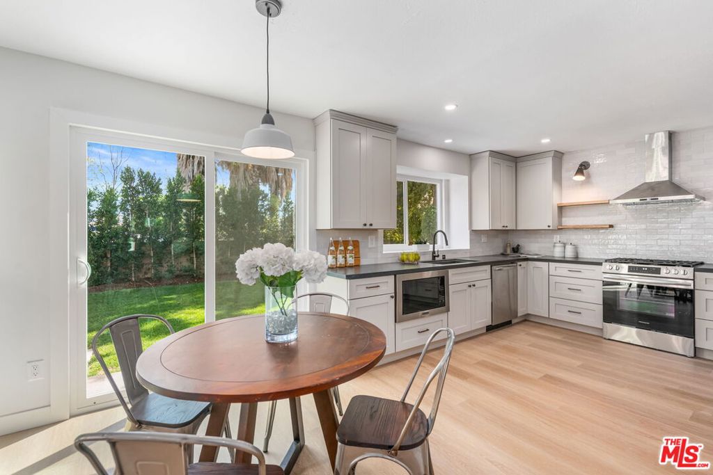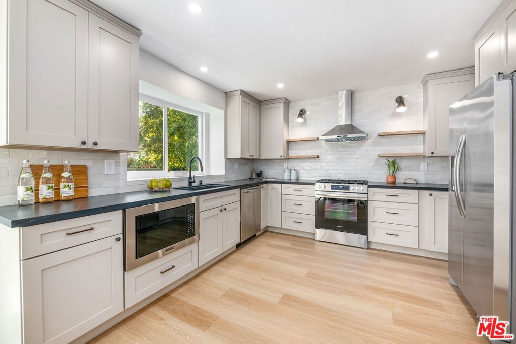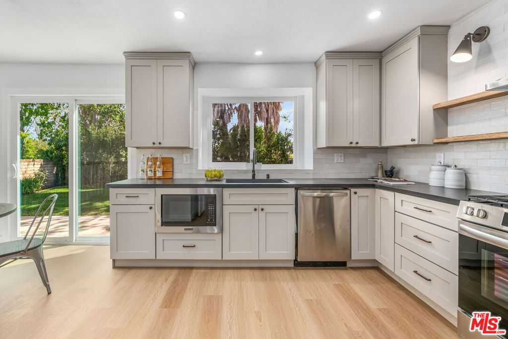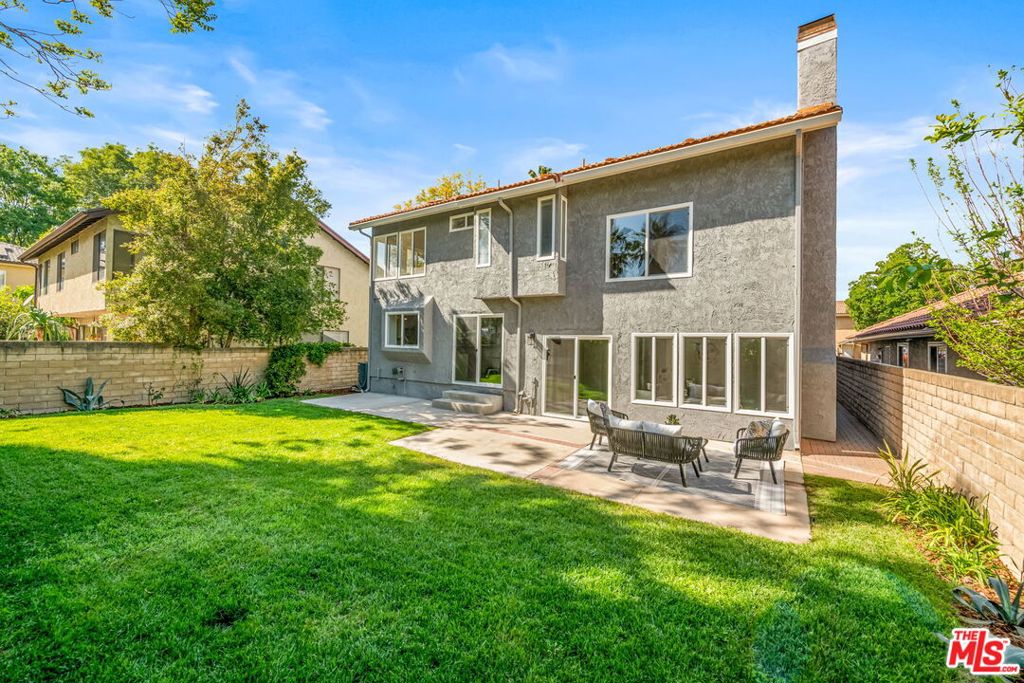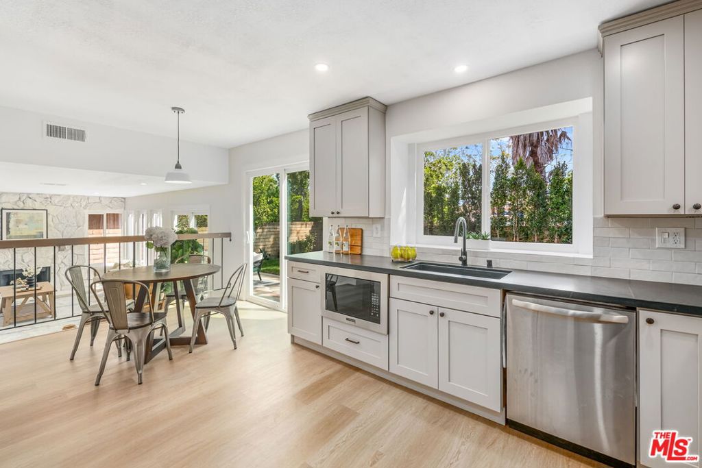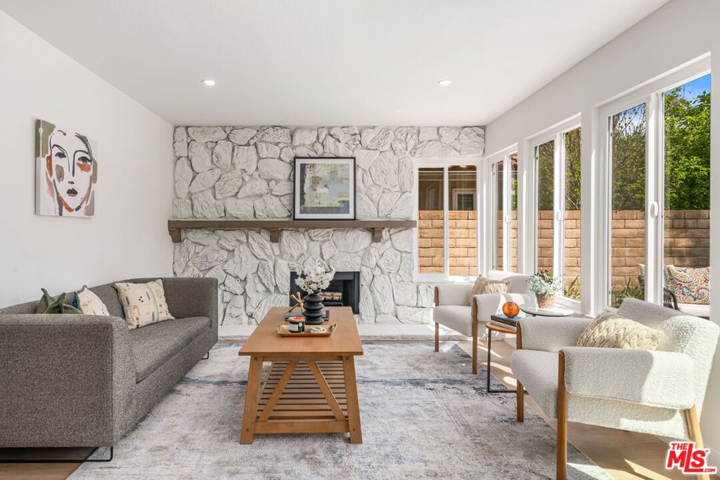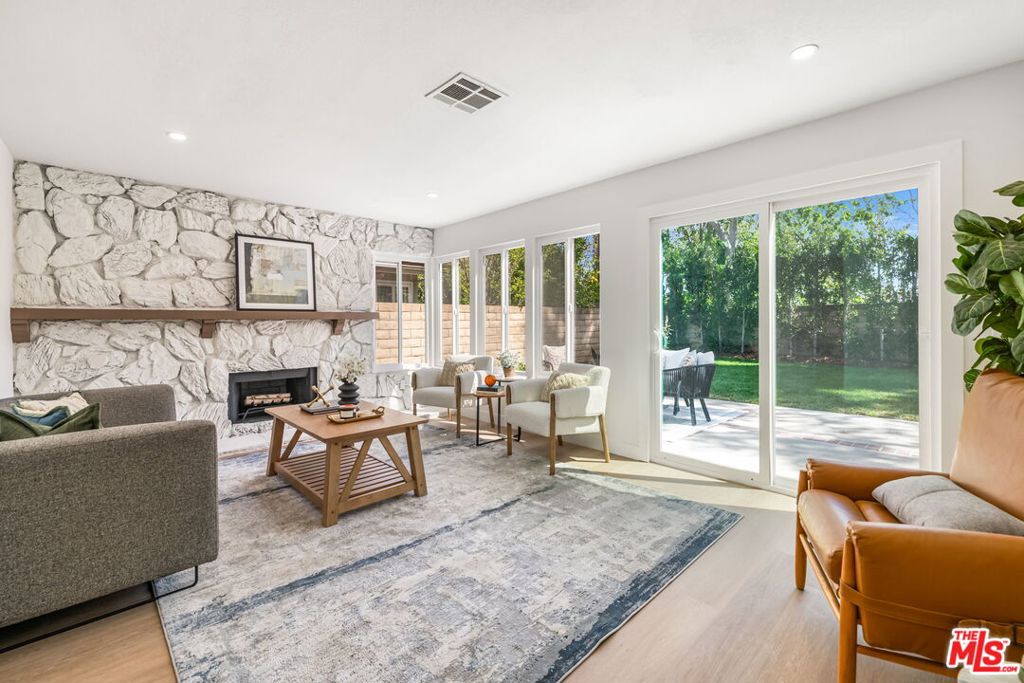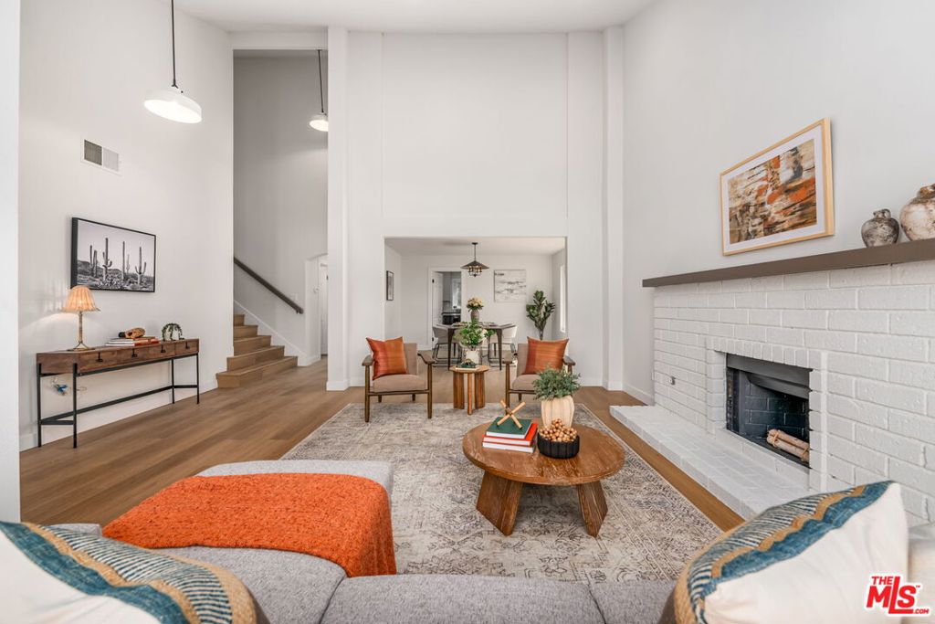 Beautifully updated two-story traditional makes a striking first impression with its timeless brick-accented facade, manicured landscaping, brick-paved driveway, and welcoming covered entry. Step inside the sun-soaked living room with soaring vaulted ceilings, wide-plank laminate wood floors, and recessed lighting. A stunning whitewashed brick fireplace anchors the space with character and charm. The open-concept layout flows naturally into a spacious dining room filled with natural light. The thoughtfully designed kitchen features soft-tone shaker cabinetry, quartz countertops, floating shelves, and stainless-steel appliances all framed by large windows and sliding glass doors that overlook the expansive backyard. A cozy breakfast nook connects to the lower-level family room, which centers around a dramatic floor-to-ceiling stone fireplace, flanked by oversized windows that bring the outdoors in. Upstairs, the generous primary suite with soaring vaulted ceilings offers a peaceful retreat, complete with a walk-in closet and a private en-suite bathroom that blends space, light, and modern style. Features include a dual-sink vanity, checkerboard tile, a walk-in shower with frameless glass, and a freestanding tub positioned beneath high windows for natural light and privacy. Three additional bedrooms upstairs each offer unique charm including a built-in window bench in one and mirrored closet doors in another. A wide hallway with built-in cabinetry adds extra storage, while the shared bathroom offers a fresh, updated aesthetic with a double vanity, stylish lighting, and a bright, clean tub-and-shower combo. Downstairs, a fifth additional bedroom adjacent to the laundry room could easily serve as an office space for working from home. The third bathroom downstairs, with an oak-finish vanity and engineered stone top, serves as a powder room for guests. Step outside to a private backyard sanctuary with mature trees and tall hedging that create a serene, secluded feel. A spacious patio is ideal for al fresco dining and weekend gatherings, while the large, lush green lawn provides ample space for play or relaxation. THIS IS A MUST SEE!