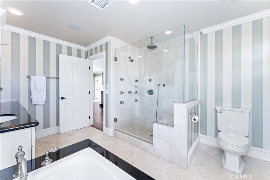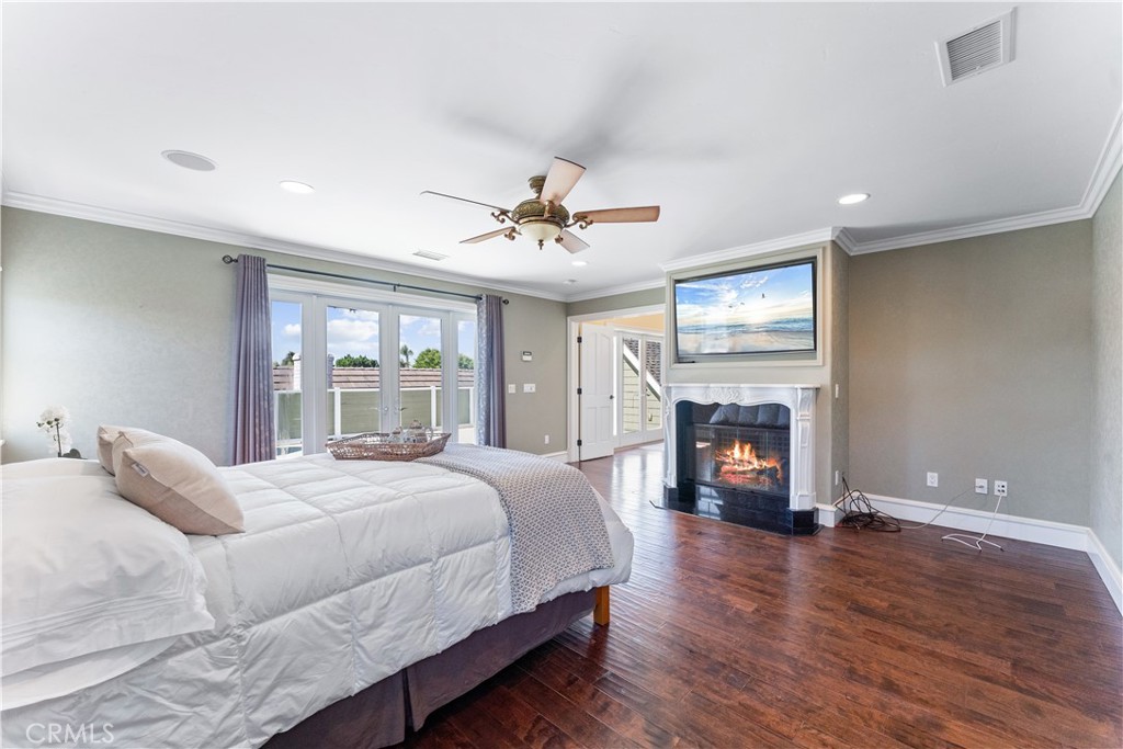 The lavish primary suite is a retreat in itself, complete with a jacuzzi-style tub and a separate walk-in shower with multiple shower heads. A generous walk-in closet, a fireplace, a wall-mounted LG smart TV, and French doors opening to a sprawling 600 sq. Ft. Deck with fireplace and TV connections, a peek-a-boo ocean view, makes this home extra special.