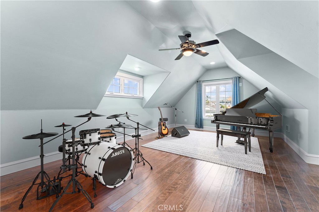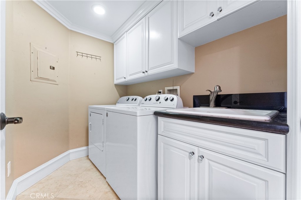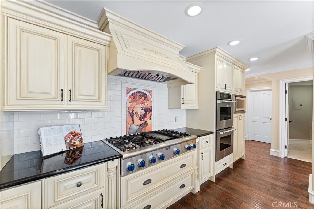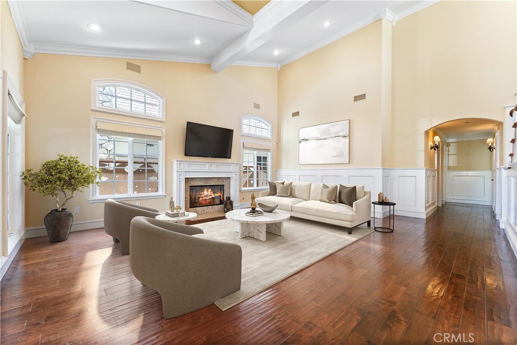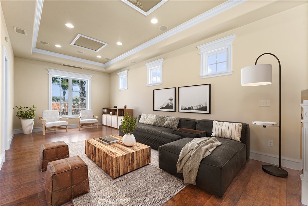 This home features 4 Bedrooms and 3 1/4 Bathrooms with 3 Bedrooms on the main level. The floor plan showcases designer touches throughout, with elegant lighting and a high ceiling. The Chef's Kitchen is as functional as it is beautiful, outfitted with a top-of-the-line Thermador 6-burner range plus griddle, microwave oven, dishwasher, and Brand-new Monogram refrigerator and freezer units. Rohl faucets and custom cabinetry, along with an expansive island. The adjoining family room features a cozy fireplace, a wall-mounted LG smart TV, and built-in JBL surround sound speakers, complete with data, audio, video, and optical wiring throughout the home, making it perfect for family movie nights.
